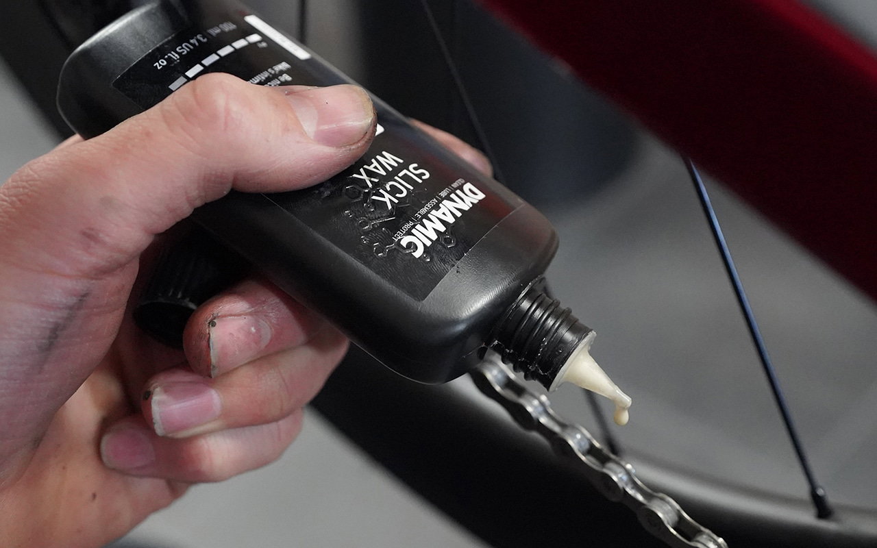 Rulati lantul printr-o carpa pentru a indeparta reziduurile de murdarie sau ceara. Puteti folosi si o perie pentru caseta si rotitele schimbatorului. Aplicati 1 picatura de Slick Wax pe interiorul si exteriorul fiecarei zale a lantului. Pentru cel mai bun rezultat recomandam sa asteptati 2-3 ore inainte de a iesi la o tura.